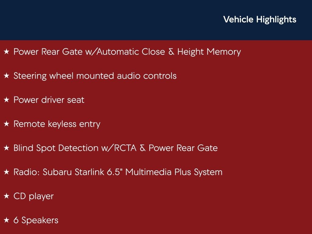 - Radio: Subaru Starlink 6.5" Multimedia Plus System