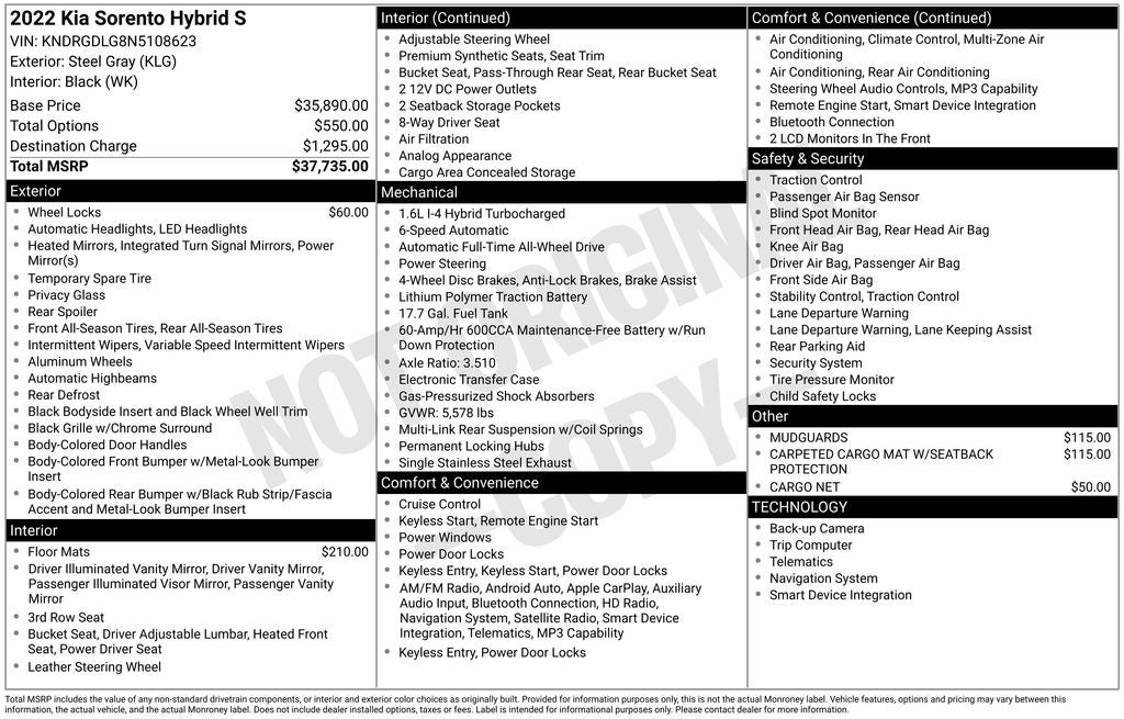 - Vehicle Name: Kia Sorento Hybrid